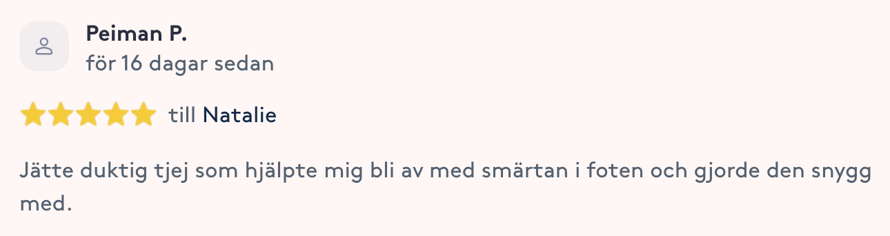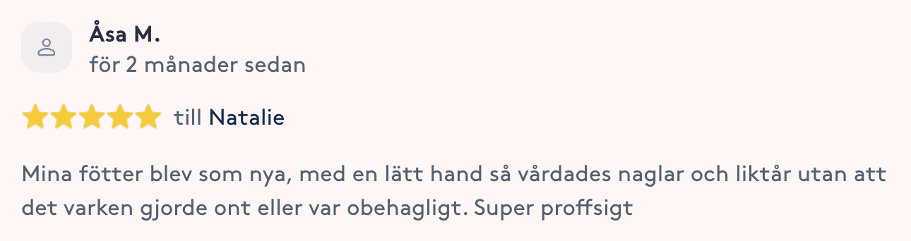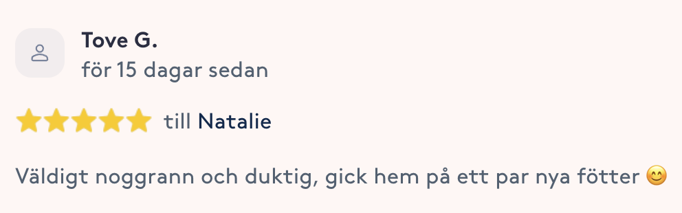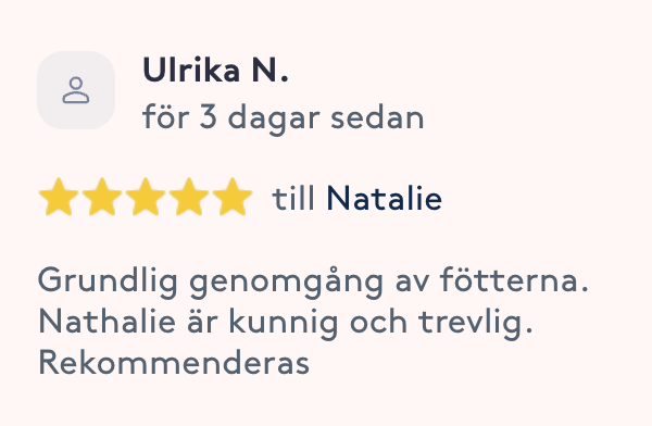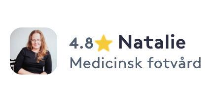 Natalie är diplomerad medicinsk fotterapeut från Axelsons Institutet i Stockholm och medlem i Svenska Fotterapeuterna.
