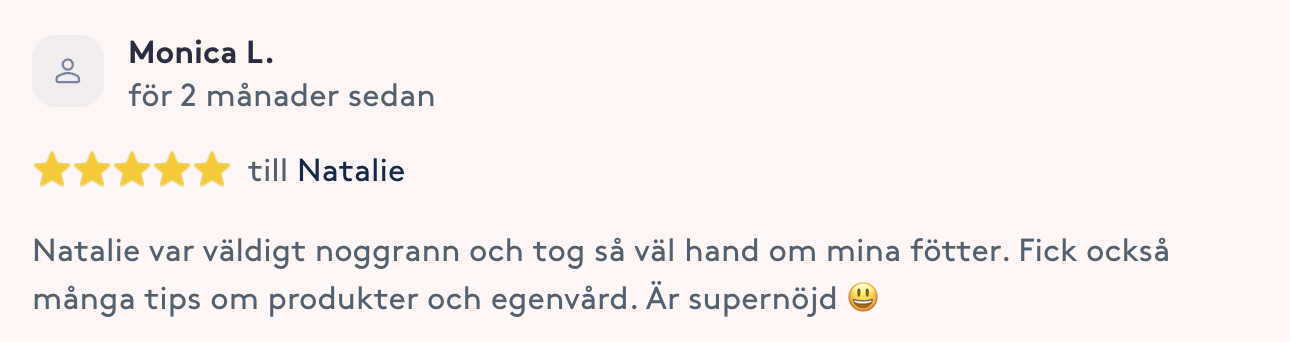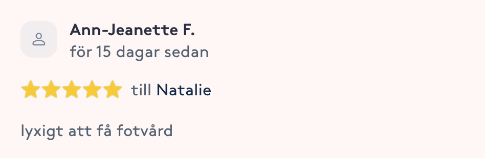 Med stor erfarenhet och ett genuint engagemang hjälper hon dig att ta hand om dina fötter – oavsett om du har specifika problem eller bara vill ge dem den vård de förtjänar.